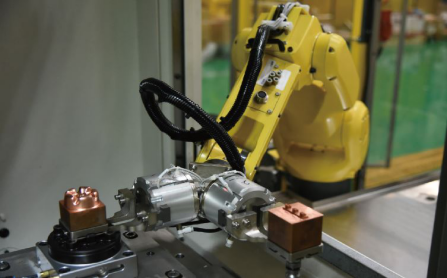 汽车模具高精度加工 l 使用最新型ROBOCUT C600iA进行汽车模具加工 l 通过Core Joint功能,能准确的保证铜丝中心位置,确保工件精度 l 通过AWF2功能,实现锥度加工情况下的自动穿丝功能,方便操作使用并能保证精度 铜电极自动化加工 l ROBODRILL小型加工中心与LR Mate200iD机器人高效联动实现铜电极等模具精密部件的动化加工 l 加工中心主轴转速24000r/min,实现高速下高精度切削 l 独有AI轮廓控制和HRV控制功能,可以大幅度减低由于伺服延迟引起的形状误差,实现极其平滑的加工表面