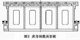 床身是本次设计工作的基础,床身的尺寸设计影响着对整机的设计,而且设计的公道性直接影响到整机的刚度。床身的截面外形为Π形(图2)。床身的上平面即工作台面设计有9 条T 形槽,为方便床身工作台面和# 形槽的精刨加工,槽完全贯通。床身的左、右两下脚各设计有一个狭长平面,用来安放转动直线导轨副。笔者把导轨面设计在床身的两下侧,主要是考虑力的传递方向与卸荷题目。因床身会受到龙门框架的重力、切削力和工件的重力,这样的设计可使龙门框架的重力直接传进到机床的基础上,而床身只受到工件的重力。床身的基本壁厚由以下公式初定。