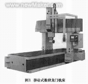 本文所述的移动式数控龙门铣床是指龙门框架作纵向移动的龙门铣床。移动式龙门铣床的最大优点是:(1)机床占地面积小。工作台移动式龙门铣床,整机长度必须两倍于纵向行程长度,而移动式龙门铣床的整机长度只需纵向行程加上龙门架侧面宽度即可。(2)机床的动态响应好。移动式龙门铣床采用的是固定工作台,一般与床身整体铸出,龙门框架纵向运动的驱动力矩等值不变,不会因工件的承载重量的改变而变化,从而保证了加工精度和机床的响应性能。